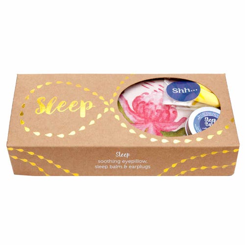 This gift set promises to indulge your senses and send you off to dreamland! Each set contains a stunning eye pillow filled with wheat and relaxing organic lavender, a soothing sleep balm and earplugs to help you get a restful night's sleep.