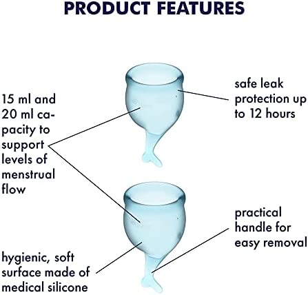 - Set of two menstrual cups; 15ml for lighter flow days and 20ml for heavier flow days