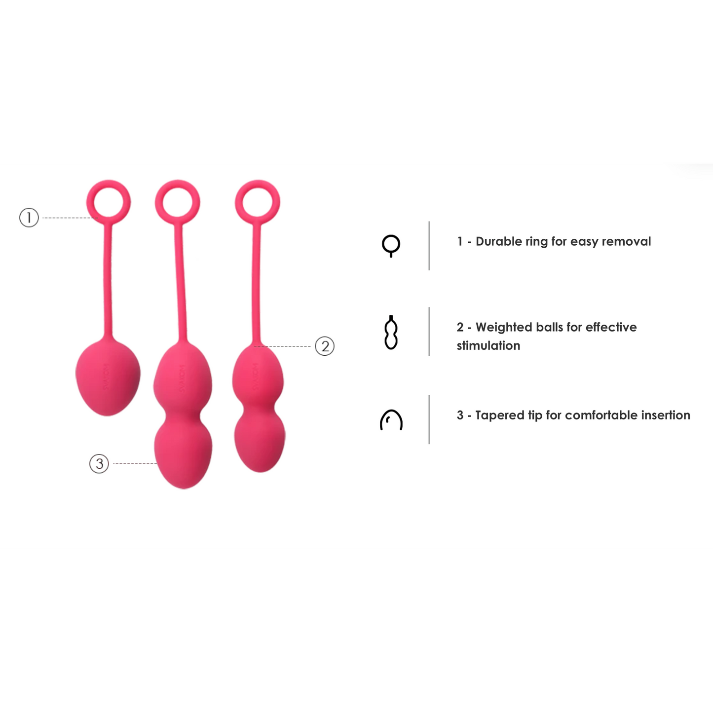 Every set of Svakom Nova Balls has three different balls with different sizes and weights, which can be applied to different types of scientific training courses. The exercise intensity increases gradually in different ways and uses different balls, be sure to follow these the instructions.